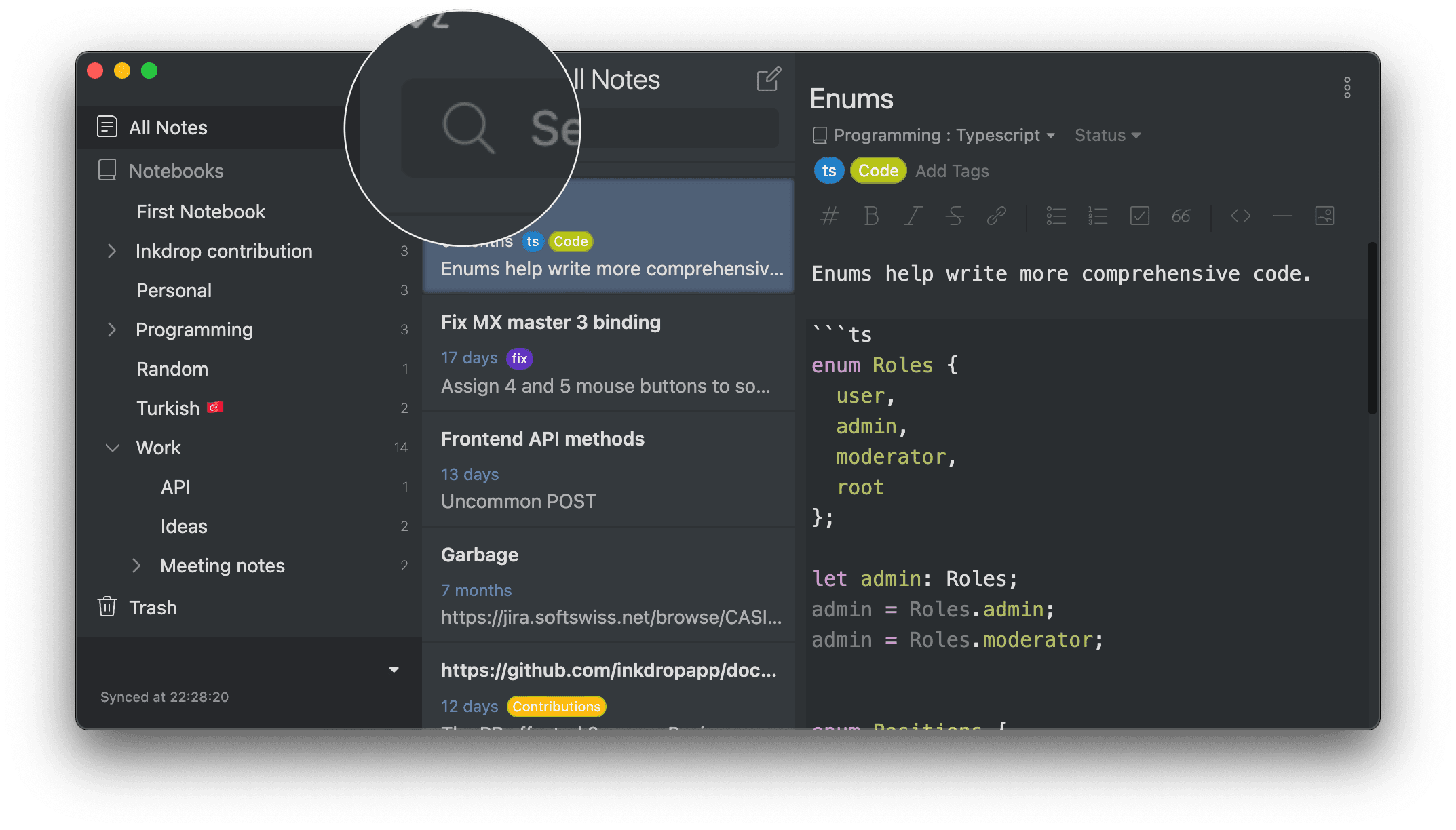 - Searching: Inkdrop looks for notes among all the records in the database. You can think of it as a global search.